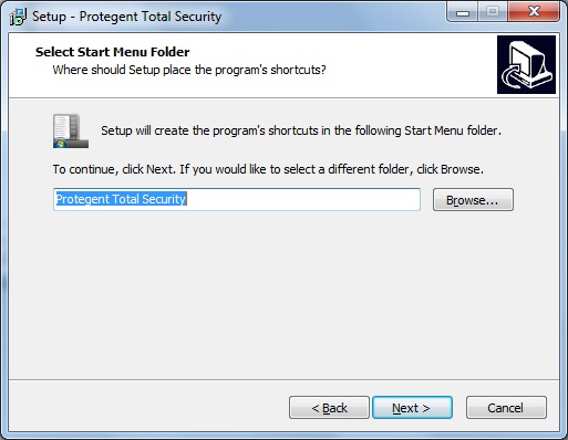 Step 6: It will take you to the “Select Start Menu folder” Window to place the program’s shortcuts. By default it will store in the “Protegent® Secure” folder, otherwise you can browse a different location. Click on “Next” to continue.